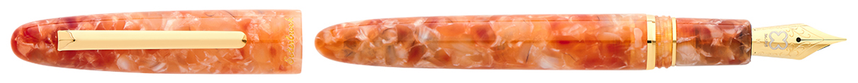 キャップとボディの素材は、アクリル樹脂を使用し、ペン先は、スティールでトリミング同様ゴールド色とシルバー色の2つのタイプの仕上げがあります。万年筆のインクの吸入方式は、カートリッジインクまたはインクコンバーターを使用してインクボトルから吸入できる両用式と呼ばれるシステムを採用しています。また、万年筆と同じデザインのボールペン(ツイストノック式)もあり、万年筆の価格は、¥30,800(税抜¥28,000)、ボールペンは、¥24,200(税抜¥22,000)からご用意しています。